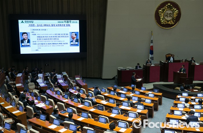 (서울=포커스뉴스) 5일 오후 서울 여의도 국회에서 열린 343회 국회(임시회) 7차 본회의, 정치·외교·통일·안보·교육·사회·문화에 관한 질문에 참석한 이용주 국민의당 의원이 황교안 국무총리에게 이정현 전 청와대 홍보수석과 김시곤 전 KBS 보도국장의 보도통제 녹취록 논란과 관련 질문하고 있다.