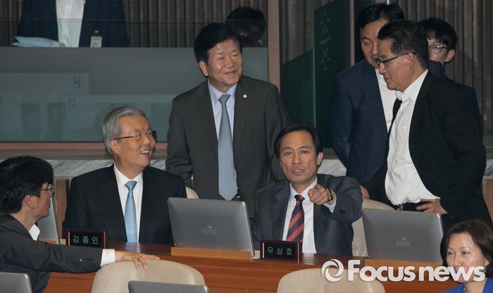 (서울=포커스뉴스) 5일 오후 서울 여의도 국회에서 열린 343회 국회(임시회) 7차 본회의, 정치·외교·통일·안보·교육·사회·문화에 관한 질문에 참석한 김종인 더불어민주당 비대위 대표, 우상호 원내대표와 박지원 국민의당 비대위원장, 김관영 원내수석부대표 등이 대화하고 있다.