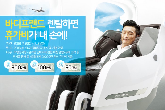 이번 이벤트는 오는 31일까지 전국 108개 직영전시장이나 온라인을 통해 안마의자를 렌탈·구매(팬텀 이상 모델)하면 자동으로 응모된다.