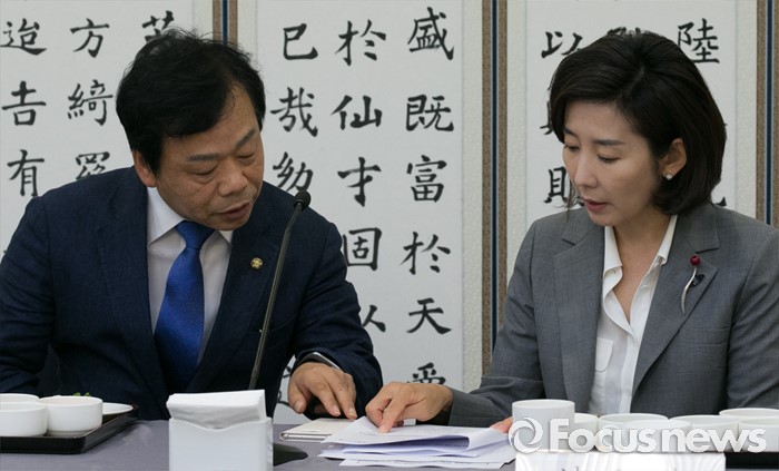 (서울=포커스뉴스) 6일 오전 서울 여의도 국회 귀빈식당에서 열린 미래인사포럼 창립총회에 참석한 나경원(오른쪽), 이완영 새누리당 의원이 대화하고 있다.