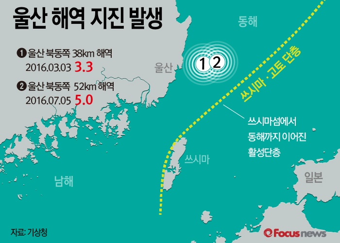 (서울=포커스뉴스) 5일 저녁 8시 33분 울산시 동구 동쪽 52㎞ 떨어진 해역에서 규모 5.0의 지진이 발생했다. 이 지역에서 올해 규모 3.0 이상의 지진이 두 번째로 발생한 것으로 전문가들 쓰시마-고토 활성 단층대의 영향이라는 분석이 나오고 있다.