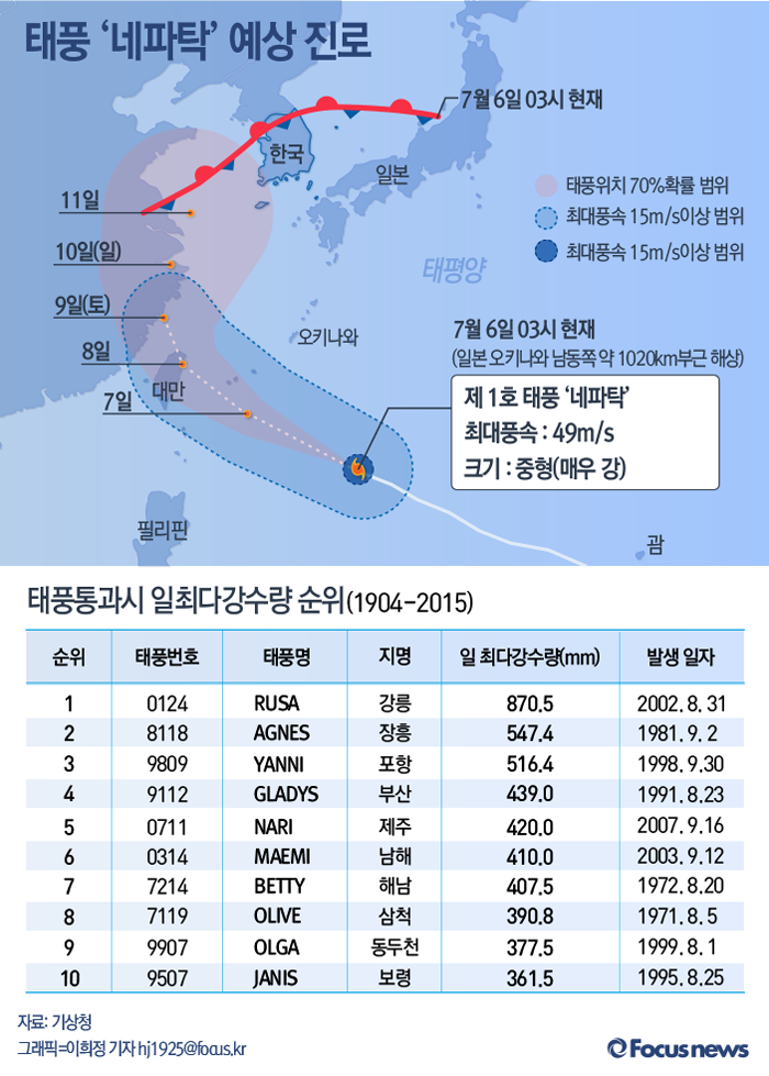 (서울=포커스뉴스) 기상청에 따르면 올해 제 1호 태풍 '네파탁'은 6일 오전 3시 현재 일본 오키나와 남남동쪽에서 서북서진하고 있다. '네파탁'은 9일(토)에 중국 동안에 상륙 후 10일(일) 오후에는 제주도 남서쪽 먼 바다에 위치 할 것으로 예상된다. 기상청은 제주도와 남해안 지방에 10일(일)~11일(월)까지 매우 강한 바람과 함께 비가 많이 올 것으로 예보했다.