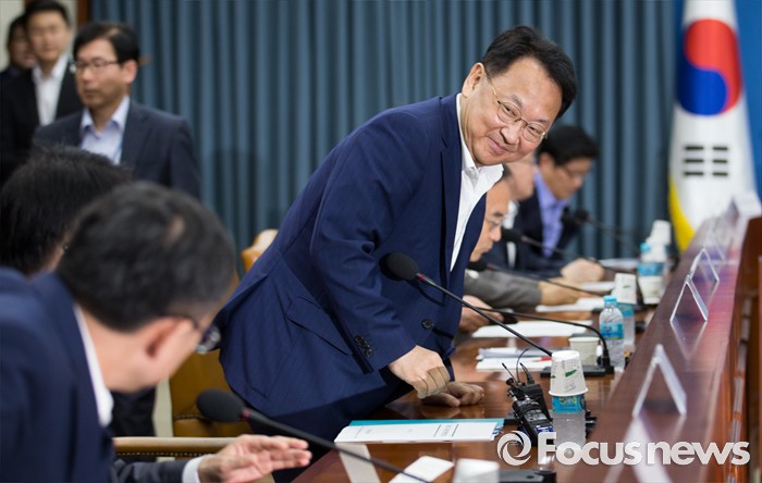(서울=포커스뉴스) 6일 오전 서울 종로구 정부서울청사에서 열린 제19차 재정전략협의회에 자리한 유일호(오른쪽) 경제부총리 겸 기획재정부 장관이 참석자들과 인사하고 있다.