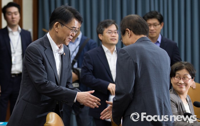 (서울=포커스뉴스) 6일 오전 서울 종로구 정부서울청사에서 열린 제19차 재정전략협의회에 참석한 강호인(왼쪽 두번째) 국토교통부 장관이 참석자들과 인사하고 있다.