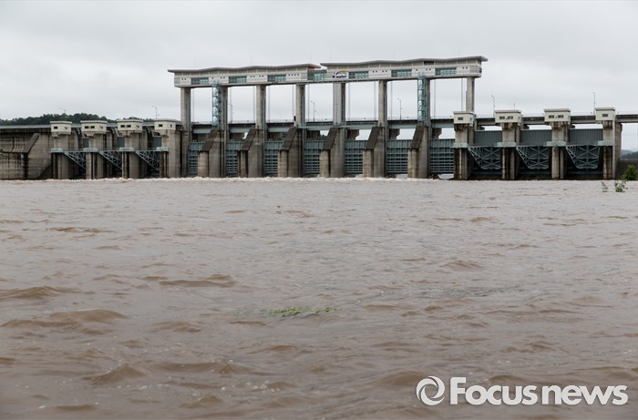 (연천=포커스뉴스) 북한이 황강댐을 방류한 6일 오전 경기도 연천군 군남홍수조절지에서 한국수자원공사가 수위조절을 위해 임진강 강물을 방류하고 있다.