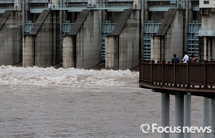 (연천=포커스뉴스) 북한이 황강댐을 방류한 6일 오전 경기도 연천군 군남홍수조절지에서 한국수자원공사가 수위조절을 위해 임진강 강물을 방류하고 있다.
