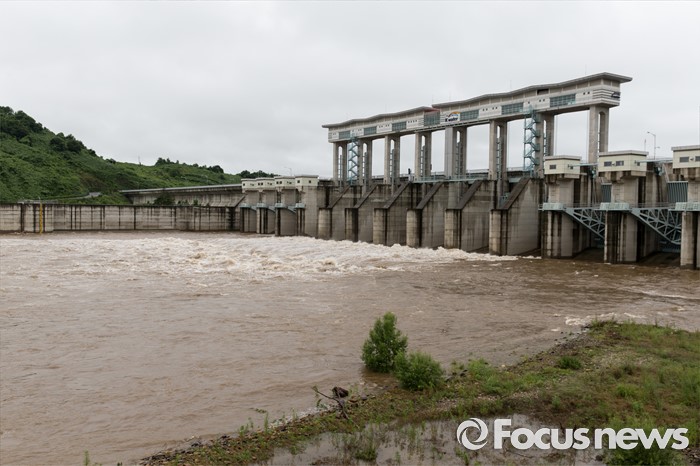 (연천=포커스뉴스) 북한이 황강댐을 방류한 6일 오전 경기도 연천군 군남홍수조절지에서 한국수자원공사가 수위조절을 위해 임진강 강물을 방류하고 있다.