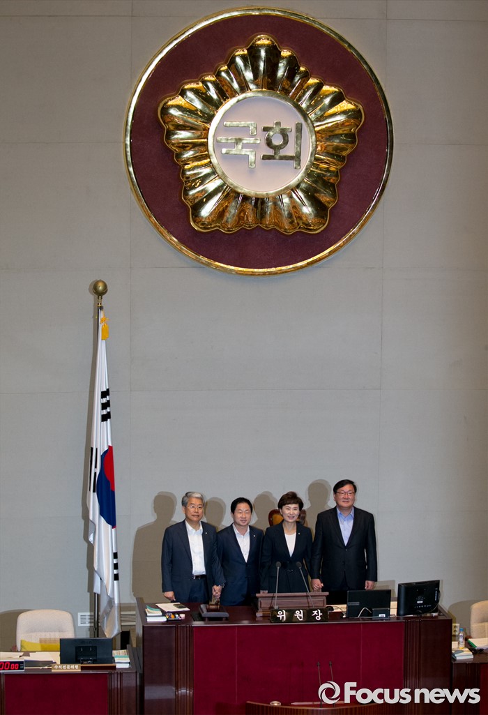 (서울=포커스뉴스) 6일 오전 서울 여의도 국회에서 열린 예산결산특별위원회 전체회의에 참석한 김현미 위원장과 3당 간사가 취재진을 향해 포즈를 취하고 있다. 왼쪽부터 김동철 국민의당 간사, 주광덕 새누리당 간사, 김 위원장, 김태년 더불어민주당 간사.