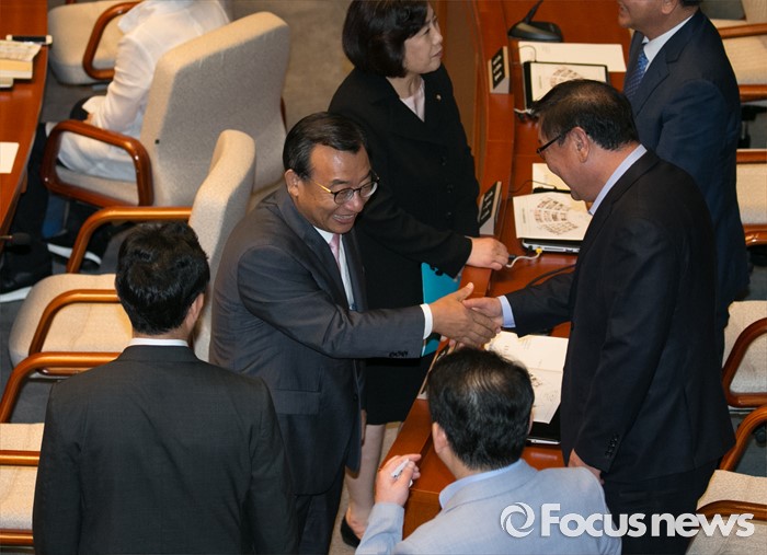 (서울=포커스뉴스) 6일 오전 서울 여의도 국회에서 열린 예산결산특별위원회 전체회의에 참석한 이정현(왼쪽) 새누리당 의원이 동료 의원들과 인사하고 있다.