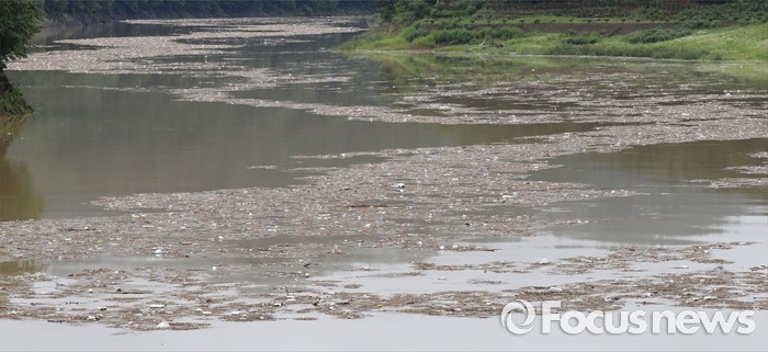 (옥천=포커스뉴스) 며칠간 이어진 중부지역 집중호우로 6일 오후 충북 옥천군 군복면 대청호 상류 일대에 쓰레기로 뒤덮혀 있다.