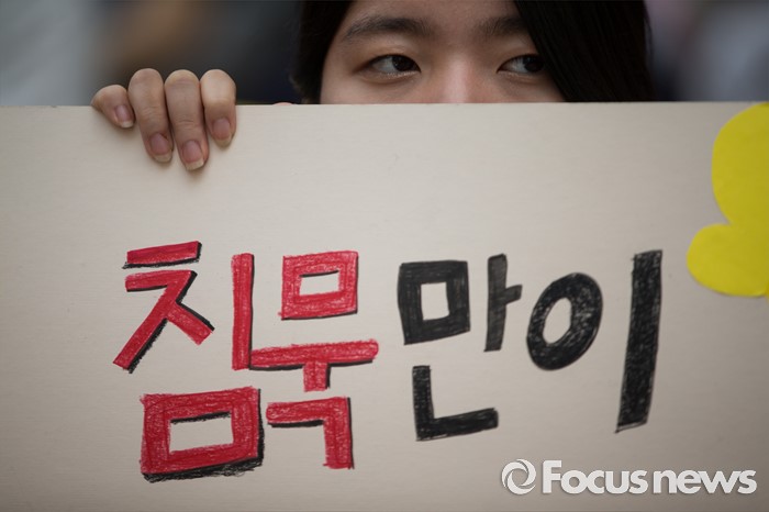 (서울=포커스뉴스) 6일 오후 서울 종로구 주한일본대사관 앞에서 열린 일본군 '위안부' 문제 해결을 위한 제1238차 정기 수요집회에서 한 학생이 한일합의를 반대하는 피켓을 들고 있다.