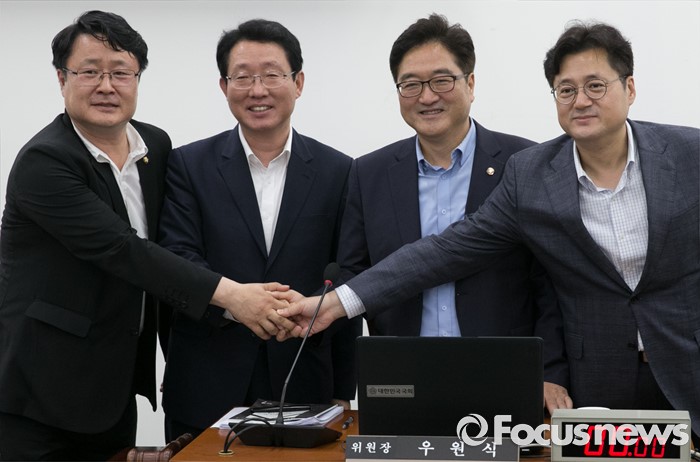 (서울=포커스뉴스) 6일 오후 서울 여의도 국회에서 가습기살균제 사고 진상규명과 피해구제 및 재발방지 대책마련을 위한 국정조사특별위원회 전체회의를 마친 우원식 위원장과 3당 간사가 취재진을 향해 포즈를 취하고 있다. 왼쪽부터 송기석 국민의당 간사, 김상훈 새누리당 간사, 우 위원장, 홍익표 더불어민주당 간사.