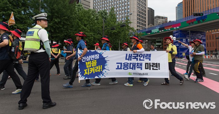 (서울=포커스뉴스) 전국건설노동조합 조합원들이 6일 오후 서울역광장에서 총파업 집회에 앞서 건설사 직접 시공제 도입 등 18대 대정부 요구안 제시를 촉구하며 가두행진을 하고 있다.