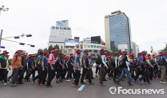 (서울=포커스뉴스) 전국건설노동조합 조합원들이 6일 오후 서울역광장에서 총파업 집회에 앞서 건설사 직접 시공제 도입 등 18대 대정부 요구안 제시를 촉구하며 가두행진을 하고 있다.