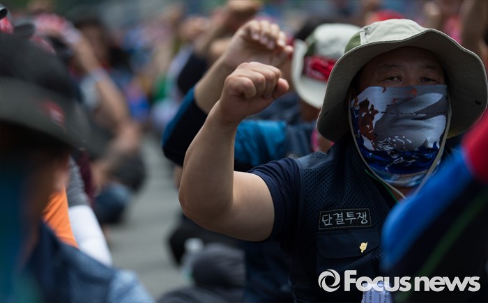 (서울=포커스뉴스) 전국건설노동조합 조합원들이 6일 오후 서울역광장에서 총파업 집회에 앞서 건설사 직접 시공제 도입 등 18대 대정부 요구안 제시를 촉구하는 구호를 외치고 있다.