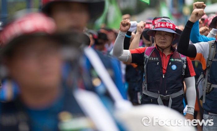 (서울=포커스뉴스) 전국건설노동조합 조합원들이 6일 오후 서울역광장에서 총파업 집회에 앞서 건설사 직접 시공제 도입 등 18대 대정부 요구안 제시를 촉구하는 구호를 외치고 있다.
