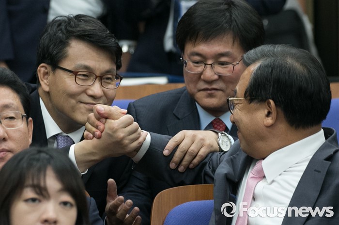(서울=포커스뉴스) 6일 오후 서울 여의도 국회에서 열린 새누리당 의원총회에 참석한 윤상현(왼쪽), 이정현 의원이 악수하고 있다.