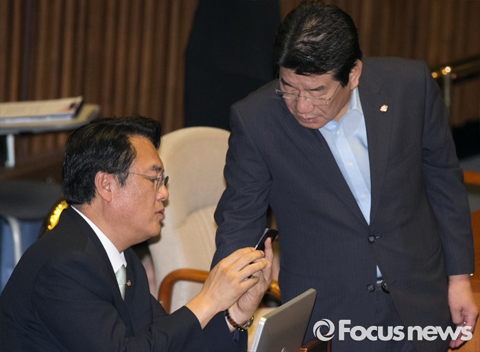 (서울=포커스뉴스) 6일 오후 서울 여의도 국회에서 열린 343회 국회(임시회) 8차 본회의에 참석한 정진석(왼쪽) 새누리당 원내대표와 강석호 의원이 대화하고 있다.
