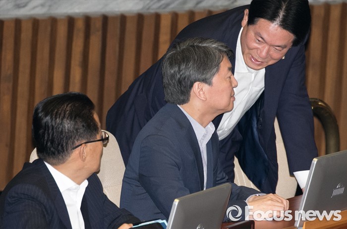 (서울=포커스뉴스) 6일 오후 서울 여의도 국회에서 열린 343회 국회(임시회) 8차 본회의에 참석한 안철수(가운데) 국민의당 전 대표와 이동섭(오른쪽) 의원이 대화하고 있다.