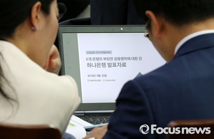 (세종=포커스뉴스) 지난달 22일 세종시 정부세종청사 공정거래위원회 심판정에서 열린 6개 시중은행(국민·농협·신한·우리·하나·SC은행)의 양도성예금증서(CD)금리 담합의혹에 대한 심의에 앞서 은행관계자들이 발표자료를 준비하고 있다. 6일 공정위 전원회의는 CD금리 담합과 관련해 법 위반 여부를 결정하기 어렵다고 판단, 심의절차를 종료 한다고 밝혔다.