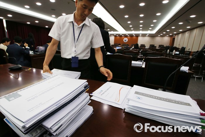 (세종=포커스뉴스) 지난달 22일 세종시 정부세종청사 공정거래위원회 심판정에서 열린 6개 시중은행(국민·농협·신한·우리·하나·SC은행)의 양도성예금증서(CD)금리 담합의혹에 대한 심의에 앞서 공정위 직원들이 관련 자료를 정리하고 있다. 6일 공정위 전원회의는 CD금리 담합과 관련해 법 위반 여부를 결정하기 어렵다고 판단, 심의절차를 종료 한다고 밝혔다.