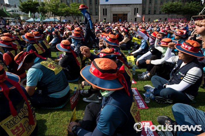 (서울=포커스뉴스) 6일 오후 서울 중구 서울시청광장에서 열린 '건설노동자 총력투쟁 결의대회'에 참석한 조합원들이 안전한 건설현장을 촉구하며 구호를 외치고 있다.