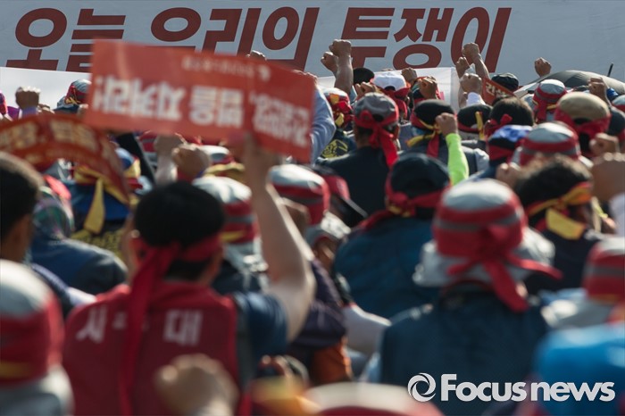 (서울=포커스뉴스) 6일 오후 서울 중구 서울시청광장에서 열린 '건설노동자 총력투쟁 결의대회'에 참석한 조합원들이 안전한 건설현장을 촉구하며 구호를 외치고 있다.