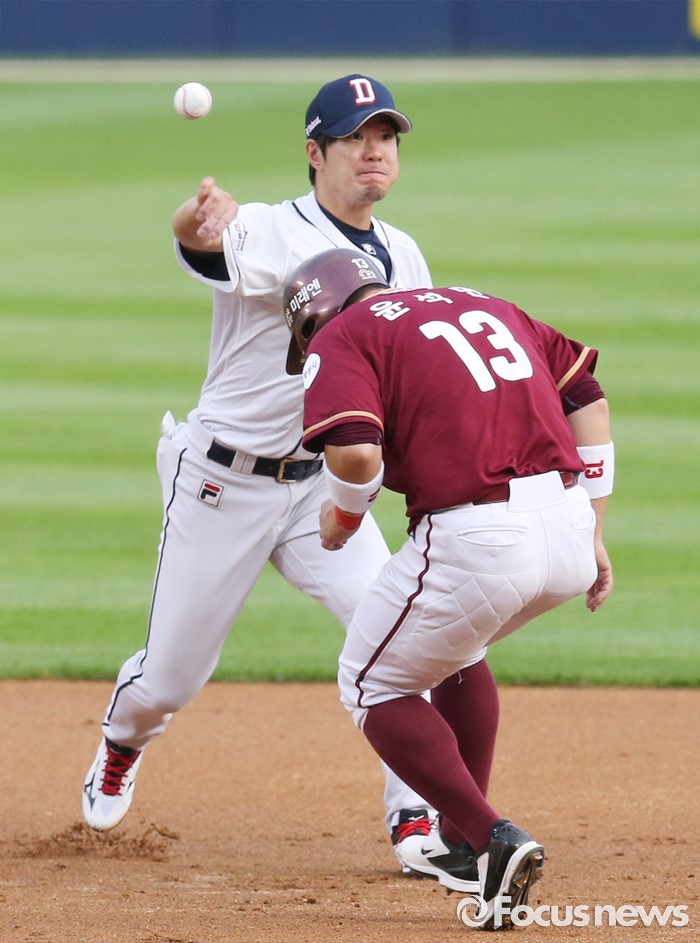 (서울=포커스뉴스) 6일 서울 잠실구장에서 열린 2016 프로야구 넥센-두산 경기 2회초 무사 1루에서 두산 유격수 김재호가 넥센 대니 돈의 1루땅볼때 1루주자 윤석민을 2루에서 포스아웃시키고 1루로 송구해 더블플레이를 성공시키고 있다.