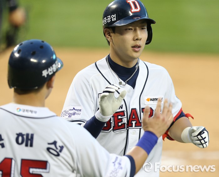 (서울=포커스뉴스) 6일 서울 잠실구장에서 열린 2016 프로야구 넥센-두산 경기 4회말 1사 1루에서 두산 박건우가 우월 2점 홈런을 치고 선행주자 국해성의 환영을 받으며 홈인하고 있다.