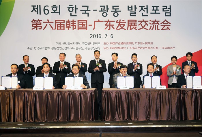 (서울=포커스뉴스) 우태희 산업통상자원부 2차관이 6일 서울 신라호텔 다이너스티홀에서 허종요우(何忠友) 광동성 부성장, 김정관 무역협회 부회장, 황순택 주광저우 총영사, 쩌우창팅(周长亭) 중국주한국총영사관 공사, 박청원 전자부품연구원장, 천이웨이(陈奕威) 혜주시 당서기, 쩡찌엔롱(郑建荣) 광동성 상무청장, 장 화(张 华) 광동성 CCPIT 부회장, 리동셩(李东生) TCL그룹 회장 등 양국 정부대표단 및 현지기업인 등 300여명이 참석한 가운데 열린 제6회 한-광동성 발전포럼 개회식에 참석해 기조연설을 한 후 전자부품연구원(박청원 전자부품연구원장)과 광동성과학원(리딩창(李定强) 부원장)간 합작의향서 등 7건의 MOU 체결식을 하고 있다. <사진제공=산업통상자원부>