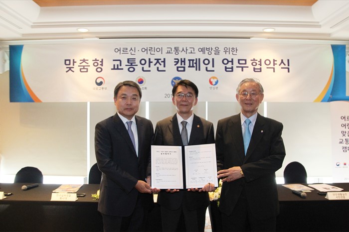 (서울=포커스뉴스) 강호인 국토교통부장관이 6일 서울 서초구 메리어트 호텔에서 대한노인회(이심 회장), 한국실버경찰봉사대(임수복 회장), 안전생활실천시민연합(권도엽 대표), 현대자동차(정진행 사장)가 참석한 가운데 어르신·어린이 교통사고의 심각성에 대해 인식을 같이하고 어르신·어린이 교통사고 줄이기에 공동으로 협력하는 업무협약을 체결하고 기념촬영 하고 있다. <사진제공=국토교통부>