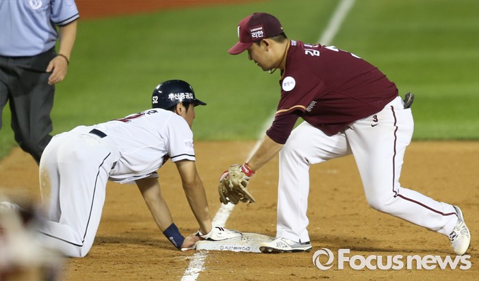 (서울=포커스뉴스) 6일 서울 잠실구장에서 열린 2016 프로야구 넥센-두산 경기8회말 2사 2루에서 두산 2루주자 김재호가 넥센 유격수의 실책으로 3루에서 세이프되고 있다.