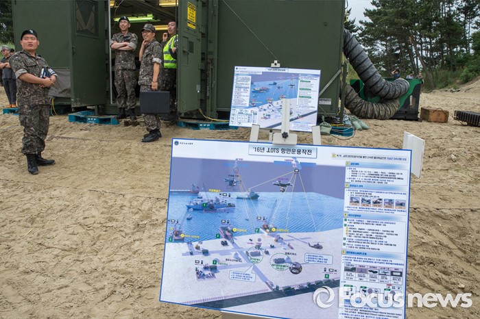 (태안=포커스뉴스) 7일 오전 충청남도 태안군 안면읍 인근 해안에서 2016 합동 해안양륙군수지원(J LOTS) 훈련이 열리고 있다. 합동참모본부 주관으로 해군과 해병대, 육군, 해경이 참가하는 합동 해안양륙군수지원 훈련은 항만 사용이 불가한 지역에서 작전을 수행중인 전투부대에 군수지운을 하기 위한 작전이다.