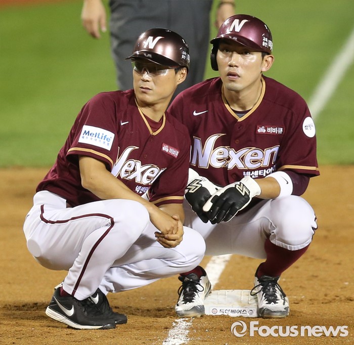 (서울=포커스뉴스) 6일 서울 잠실구장에서 열린 2016 프로야구 넥센-두산 경기 7회초 2사 1,2루에서 넥센 고종욱의 중전 안타때 1루주자 서건창이 3루에서 세이프된후 정수성 코치와 쪼그려 앉아 덕아웃의 사인을 보고 있다.