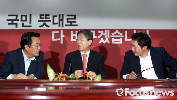 (서울=포커스뉴스) 김희옥(가운데) 새누리당 혁신비상대책위원장과 정진석(왼쪽) 원내대표, 김학재의원이 7일 오전 서울 여의도 새누리당사에서 열린 혁신비상대책위원회의에 참석해 대화 하고 있다.