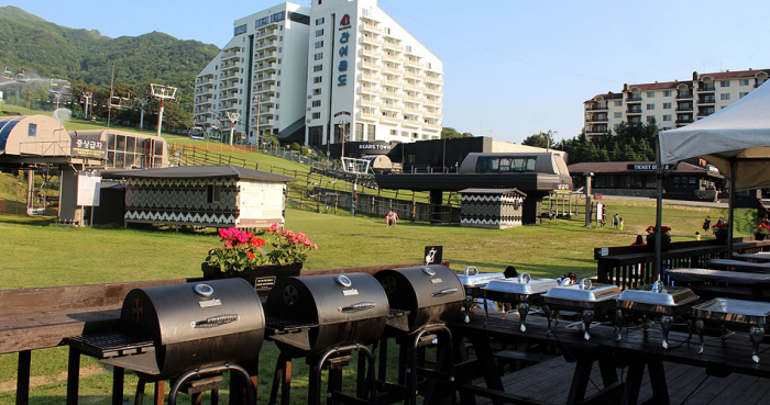 반려동물 동반 객실은 72m2(22평) 크기의 온돌 객실이며 가격은 반려동물 한 마리 기준에 27만원부터다. 단 대형 견종이나 특별 견종은 입실이 제한될 수 있으며 빌라콘도 야외 시설에는 동물 동반이 가능하지만 이 외의 건물이나 타워콘도 내 부대업장에는 동반할 수 없다.이랜드의 베어스타운 리조트.<사진제공=이랜드>
