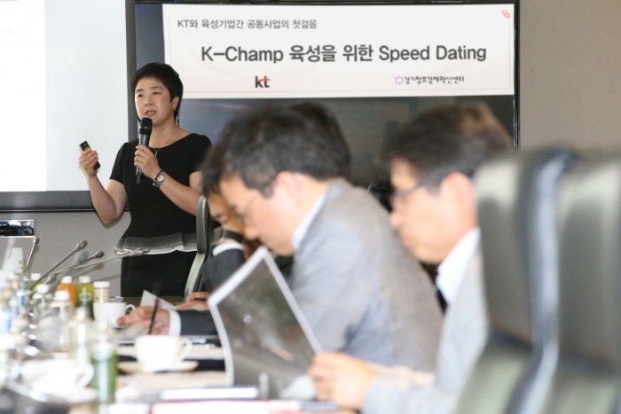 김영명 KT 창조경제추진단장은 “KT는 스타트업과의 협력을 통해 대기업이 놓치기 쉬운 기술과 시장에 대한 가능성을 찾아내 변화에 능동적으로 대처하고 있다”며 “KT는 육성기업에 대한 지원을 일회성으로 끝내지 않고 가능성이 확인된 사업에는 추가 지원과 사업 협력을 통해 눈에 보이는 성과를 만들어 낼 수 있는 브릿지 역할을 계속할 것”이라고 말했다.2차 스피드데이팅에서 경기센터 육성기업 메디플러스솔루션의 배윤정 소장이 모바일 기반 맞춤형 질환관리 서비스에 대해 발표를 하고 있다.<사진제공=KT>