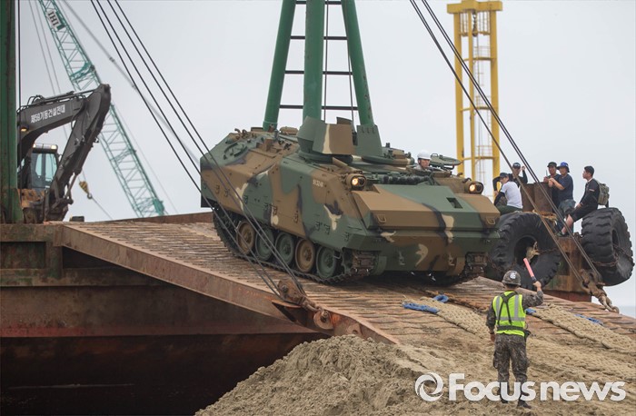 (태안=포커스뉴스) 7일 오전 충청남도 태안군 안면읍 인근 해안에서 2016 합동 해안양륙군수지원(J LOTS) 훈련이 열리고 있다. 합동참모본부 주관으로 해군과 해병대, 육군, 해경이 참가하는 합동 해안양륙군수지원 훈련은 항만 사용이 불가한 지역에서 작전을 수행중인 전투부대에 군수지운을 하기 위한 작전이다.