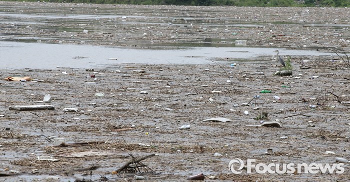 (옥천=포커스뉴스) 중부지방에 내린 집중호우로 7일 오전 충북 옥천군 군북면 대청호일대에 뒤덮힌 쓰레기 사이에서 외가리 한 마리가 먹이를 찾고 있다.