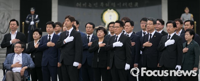 (서울=포커스뉴스) 박지원 국민의당 비상대책위원장과 비대위원 등이 7일 오전 동작구 국립서울현충원을 방문해 현충탑 참배를 마친 뒤 국기에 대한 경례를 하고 있다.