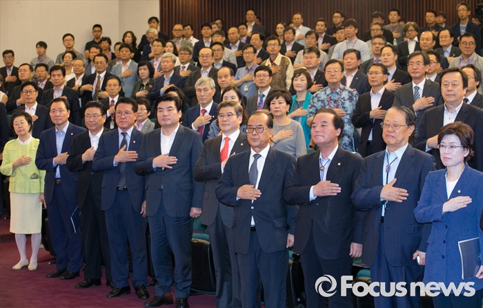 (서울=포커스뉴스) 7일 오전 서울 여의도 국회도서관에서 열린 융합혁신경제포럼 창립총회에 참석한 이은재(앞줄 왼쪽부터), 성일종, 박맹우, 정운천, 원유철, 김성태 새누리당 의원 등 참석자들이 국기에 대한 경례를 하고 있다.