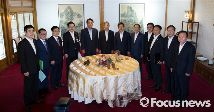 (서울=포커스뉴스) 7일 오후 서울 종로구 삼청동 국무총리공관에서 열린 당·정·청 정책조정협의회에서 참석자들이 기념촬영을 하고 있다. 왼쪽부터 이준식 사회부총리 겸 교육부 장관, 김도읍 새누리당 원내수석부대표, 김광림 정책위의장, 강석훈 청와대 경제수석, 정진석 새누리당 원내대표, 김희옥 혁신비상대책위원장, 황교안 국무총리, 이원종 대통령비서실장, 안종범 청와대 정책조정수석, 유일호 경제부총리 겸 기획재정부 장관, 이석준 국무조정실장, 김재원 청와대 정무수석.