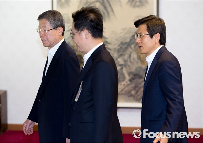 (서울=포커스뉴스) 7일 오후 서울 종로구 삼청동 국무총리공관에서 열린 당·정·청 정책조정협의회에서 황교안(오른쪽부터) 국무총리, 강석훈 청와대 경제수석, 김희옥 새누리당 혁신비상대책위원장이 회의장으로 이동하고 있다.
