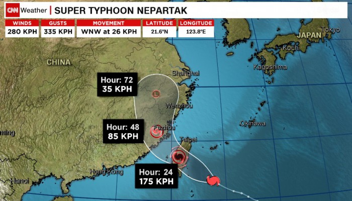 미국 CNN은 7일(현지시간) "시속 280㎞의 강풍을 동반한 태풍 네파탁이 현재 대만 동부쪽으로 향하고 있다"고 보도했다.