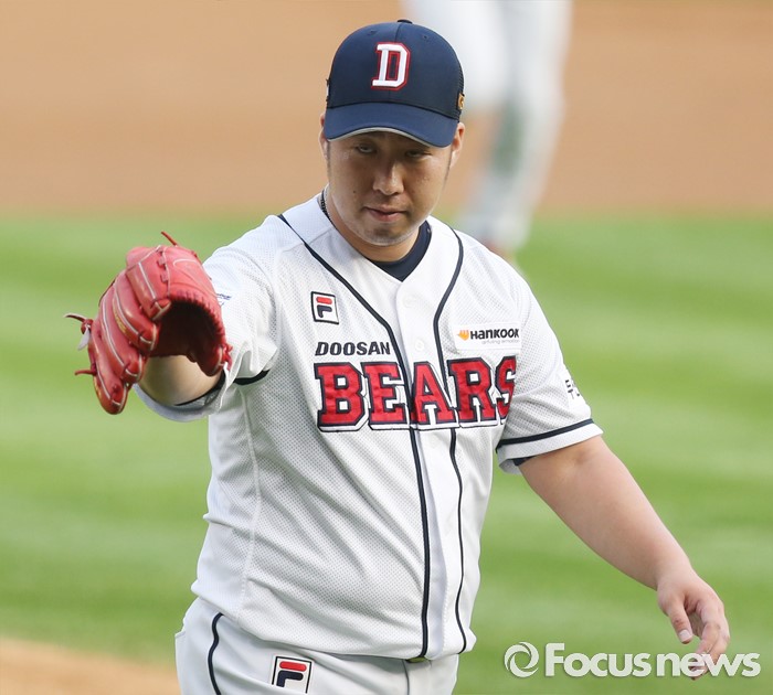 (서울=포커스뉴스) 6일 서울 잠실구장에서 열린 2016 프로야구 넥센-두산 경기에서 1회초 두산 선발투수 유희관이 넥센 김하성을 삼진 아웃시키고 포수 박세혁을 향해 격려릐 손짓을 하고 있다.