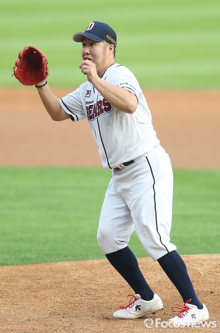 (서울=포커스뉴스) 6일 서울 잠실구장에서 열린 2016 프로야구 넥센-두산 경기에서 1회초 두산 선발투수 유희관이 넥센 서건창의 타구에 반응하고 있다.