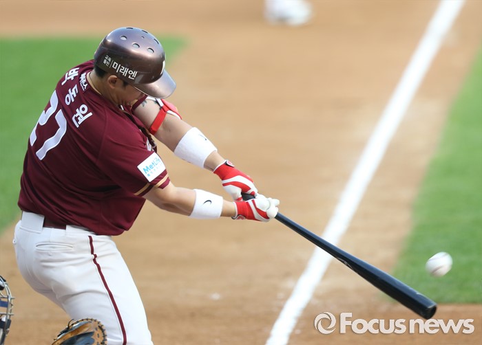 (서울=포커스뉴스) 6일 서울 잠실구장에서 열린 2016 프로야구 넥센-두산 경기 2회초 2사 만루에서 넥센 박동원이 타격하고 있다.