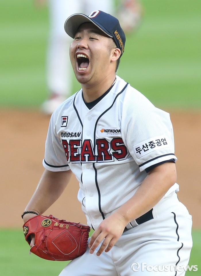 (서울=포커스뉴스) 6일 서울 잠실구장에서 열린 2016 프로야구 넥센-두산 경기 2회초 2사 1,2루에서 두산 투수 유희관이 넥센 이택근에게 투구후 아쉬워하고 있다.