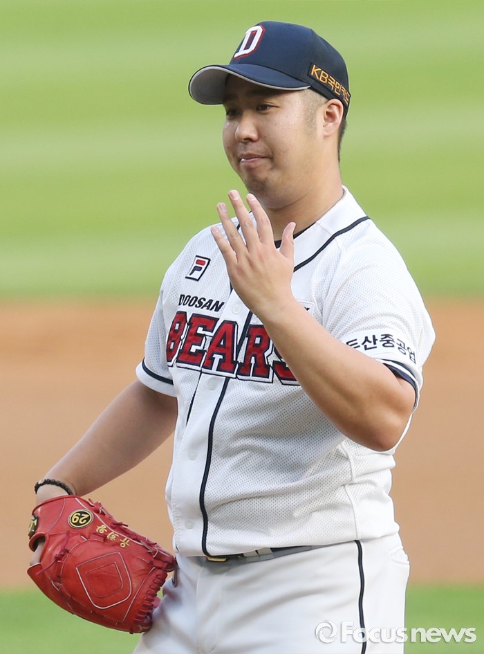 (서울=포커스뉴스) 6일 서울 잠실구장에서 열린 2016 프로야구 넥센-두산 경기에서 1회초 두산 선발투수 유희관이 투구후 제구에 아쉬워하고 있다.