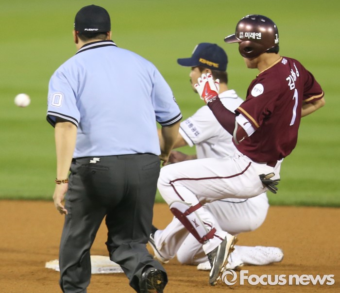 | △ 2루에서 세이프되는 넥센 김하성 |